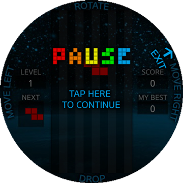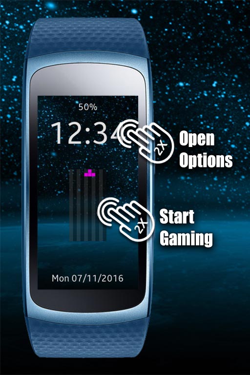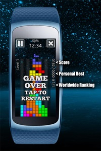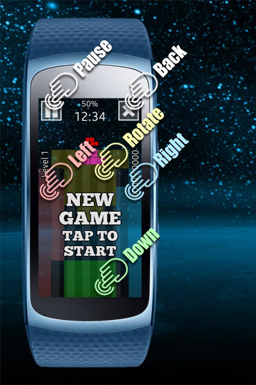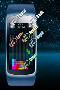 The game GEARTRIS is similar to the famous game TETRIS. You control the falling blocks by tapping on the screen (or turn the rotation bezel on your S2/S3) . Taping on the upper side rotate the block, tapping on lower side drop it down.