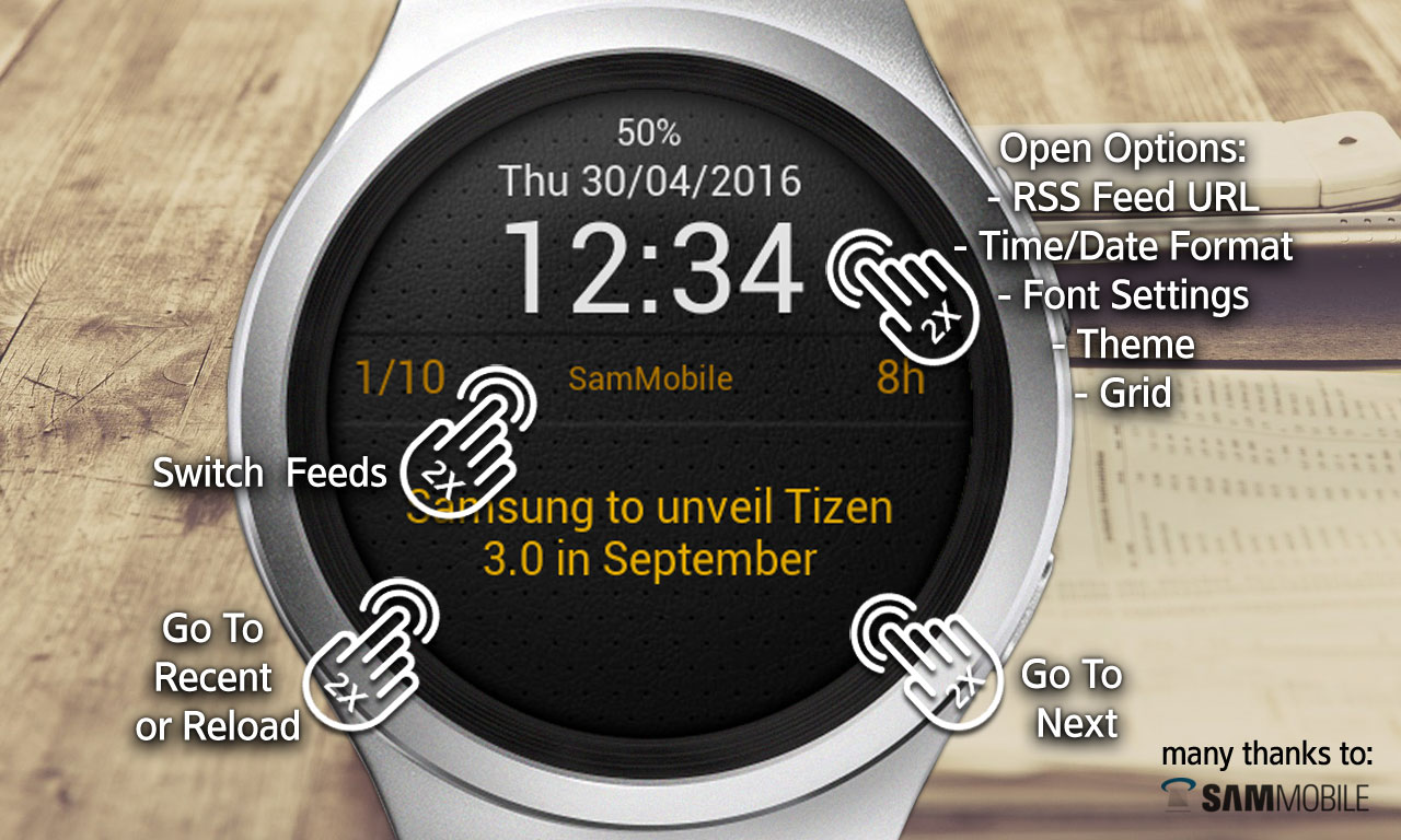 See all headlines of your interest with this watchface rss reader on your wrist! Go to next headline by double tapping on the right side, go back to recent headline by double tapping on the left side. Choose between different fonts, formats and themes by double tapping on the top of the watchface.
