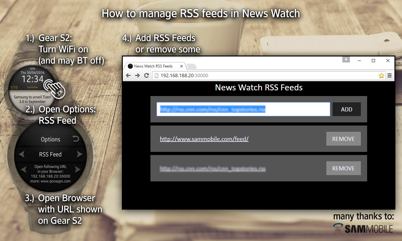 You can add new rss feeds by using a browser on your PC, when your in the same wifi network and have wifi connected on your Gear S2. Just open options screen on the watchface and enter the given URL in your PC browser (or maybe on your Tablet too). Here you can easily copy and paste your favourite rss urls in the web form. To choose between rss feeds double tap the middle info line on the watchface. If your Gear S2 online - that means your in a wifi, or have your paired smartphone near or just have 3G/eSim on your Gear - then the news will be automatically updated.