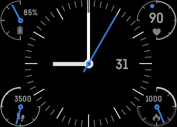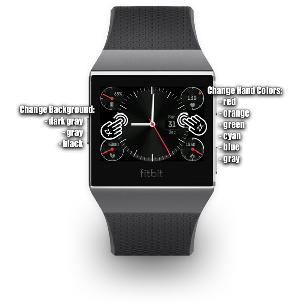 This watchface show you your heartrate, steps, burned calories, battery, date and an analog at a glance on your wrist. You can change the background and the color of the hands by rapidly double tapping the middle round clockface (left side for background and right side for color of hands).