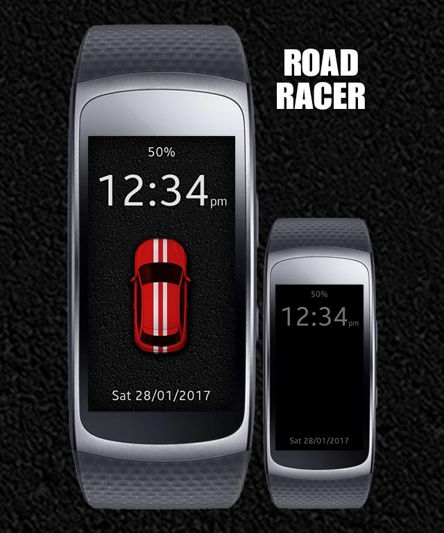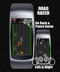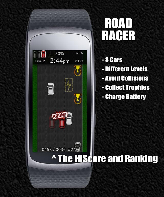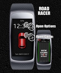 An retro like road racer game for your Gear Fit2! Control the car by tapping on the left and the right side of your screen. Avoid collisions with other cars, collect trophies and take care of your battery - just driver over the induction fields.