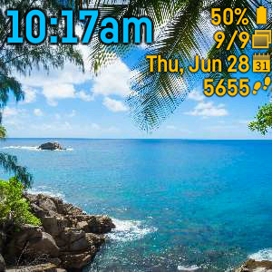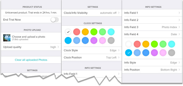 You can customize the clock and info separat. Choose color, placement and the Edge style. For every of the 4 data fields, you can choose what you want to see: Photo Index, Date, Weekday, Battery, Steps or Climbed Floors.