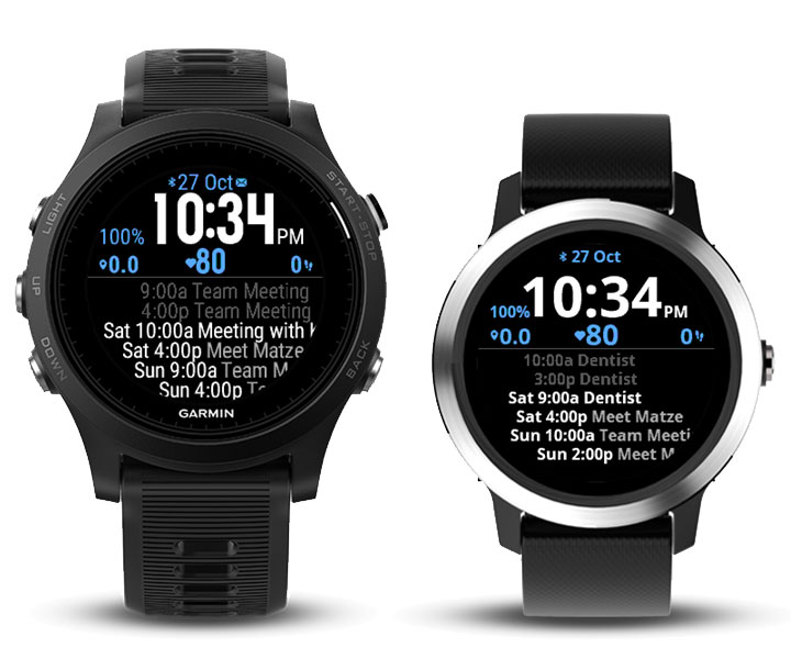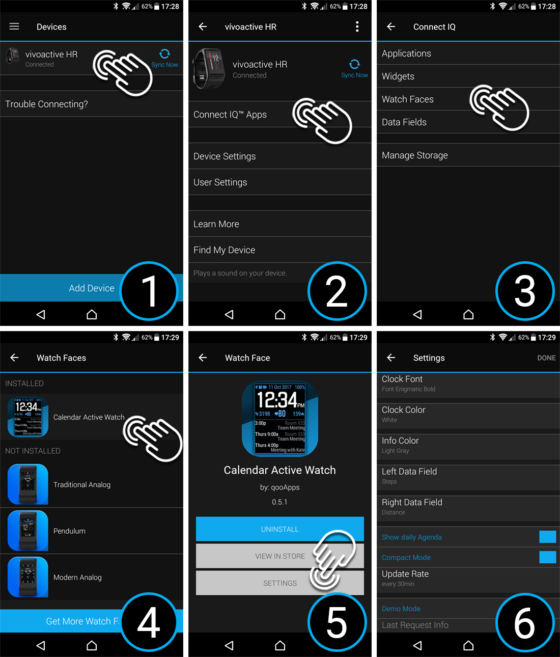 The following figure show you how to get access to the settings of Calendar Active Watch in the Garmin Connect App: